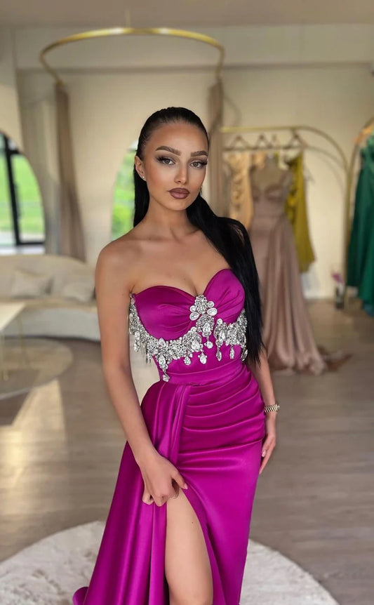 RP1779-Elegant Fuchsia Mermaid Sweetheart Crystals Sleeveless Satin Prom Evening Dresses Formal Party Gowns With Slit