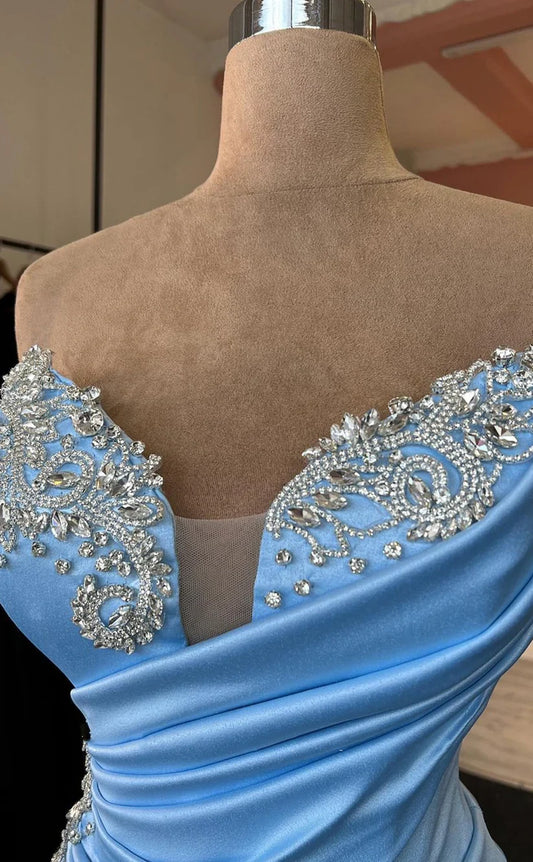 RP1777-Elegant Sky Blue Mermaid Sweetheart Crystals Sleeveless Satin Prom Evening Dresses Formal Party Gowns With Slit