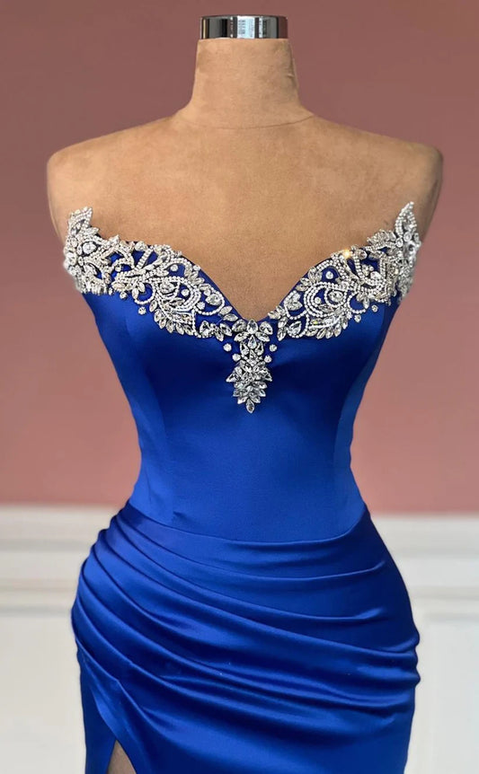 RP1776-Elegant Royal Blue Mermaid Sweetheart Crystals Sleeveless Satin Prom Evening Dresses Formal Party Gowns With Slit