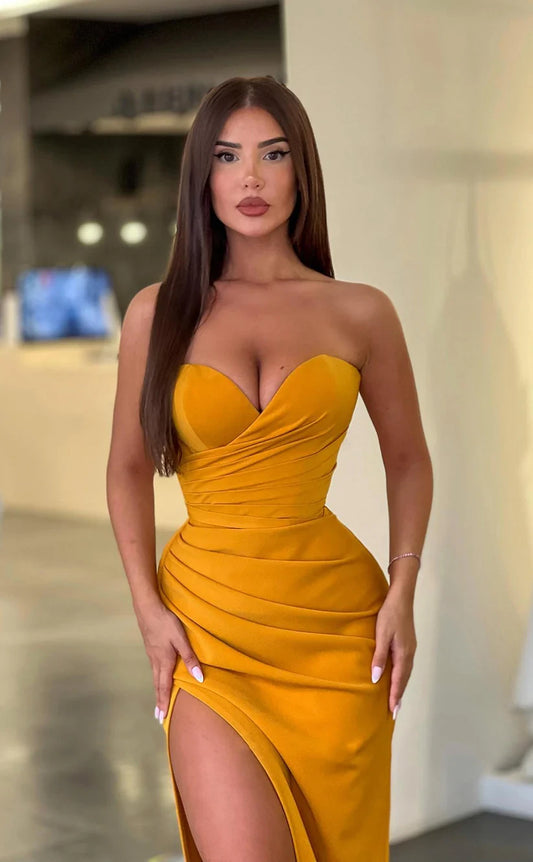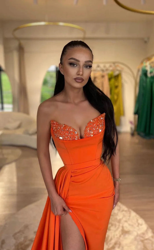 RP1816-Elegant Orange Mermaid Strapless Ruched Sequins Sleeveless Satin Prom Evening Dresses Formal Party Gowns With Slit