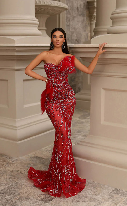 RP1732-Sparkling Red Mermaid Sweetheart Feather Beads Sleeveless Sequins Prom Evening Dresses Formal Party Gowns With Slit