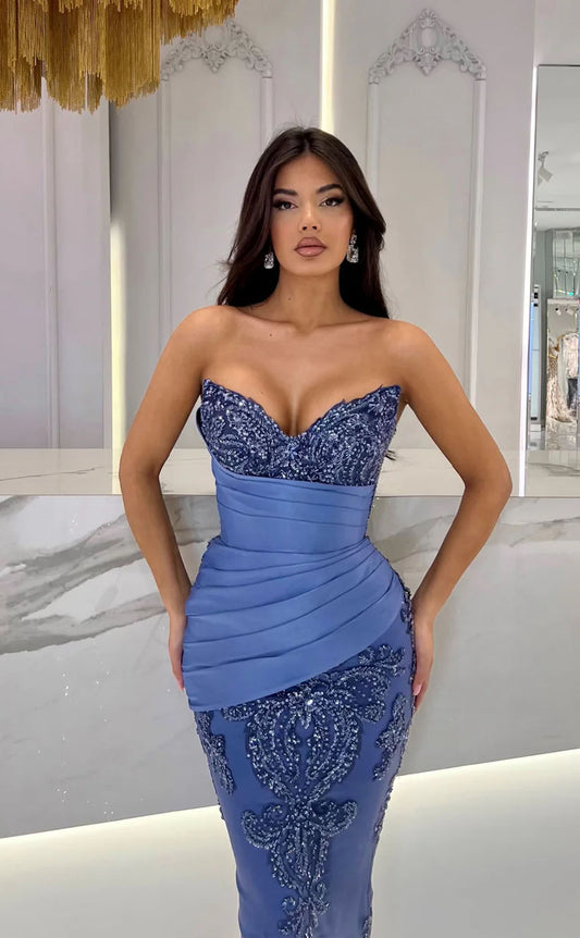 RP1745-Elegant Blue Mermaid Sweetheart Appliqued Sequins Sleeveless Satin Prom Evening Dresses Formal Party Gowns