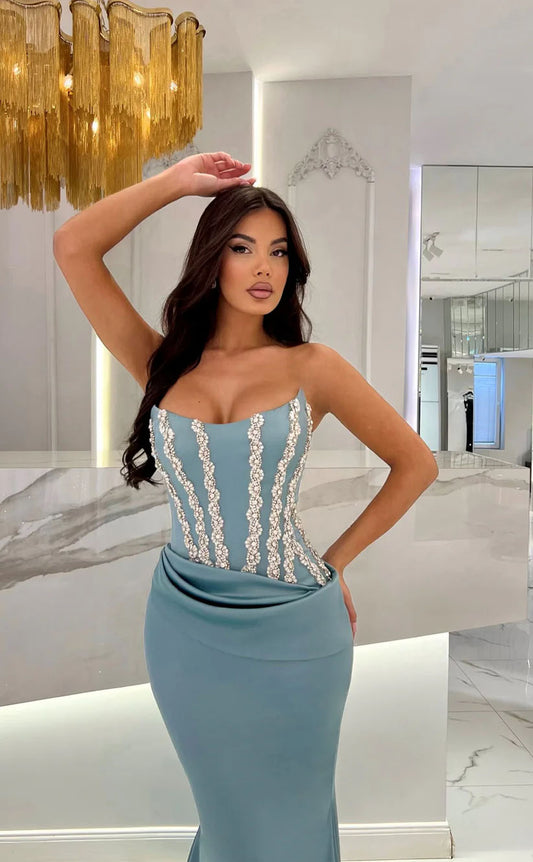 RP1741-Elegant Sky Blue Mermaid Sweetheart Crystals Sleeveless Satin Prom Evening Dresses Formal Party Gowns With Train
