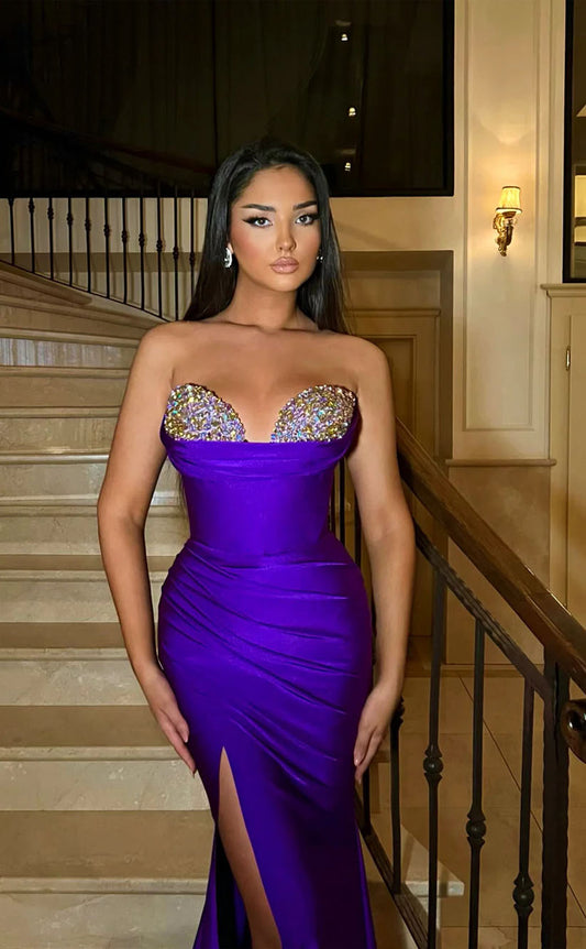 RP1743-Elegant Purple Mermaid Sweetheart Crystals Sleeveless Satin Prom Evening Dresses Formal Party Gowns With Slit