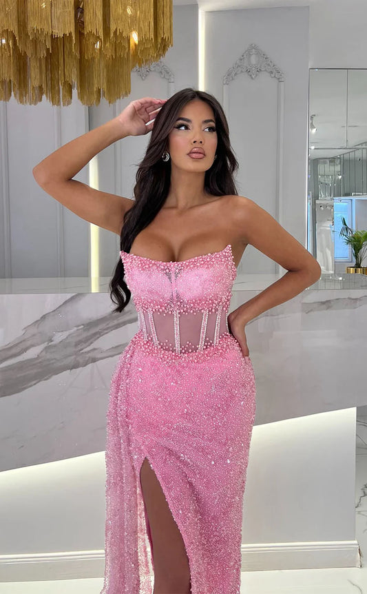 RP1733-Luxury Pink Mermaid Sweetheart Beaded Sleeveless Floor Length Sequins Prom Evening Dresses Formal Party Gowns With Slit