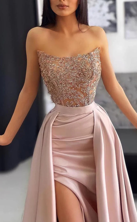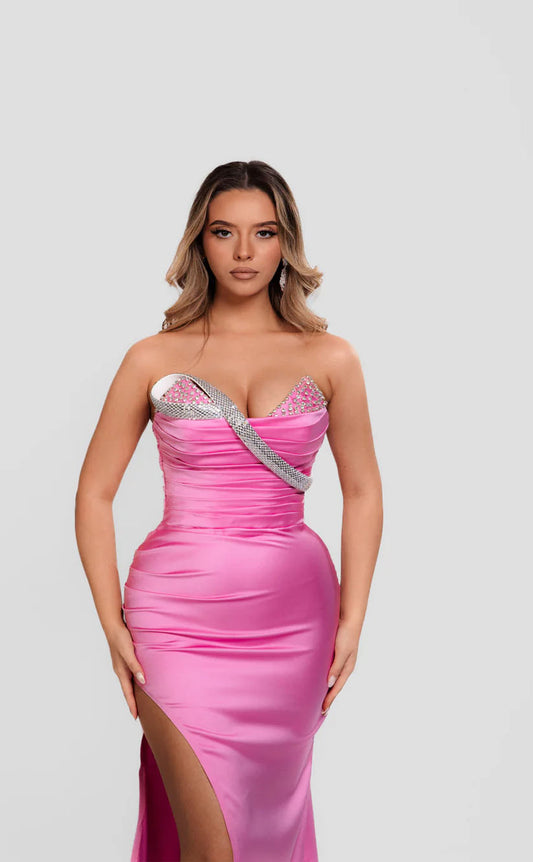 RP1726-New Pink Mermaid Sweetheart Beaded Sleeveless Floor Length Satin Prom Evening Dresses Formal Party Gowns With Slit