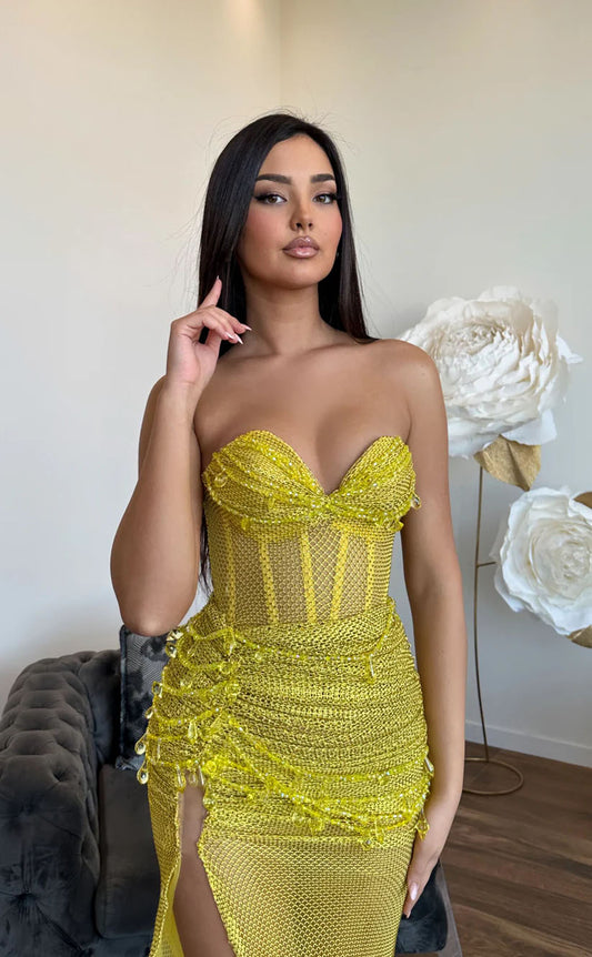 RP1728-Sparkling Yellow Mermaid Sweetheart Sequins Sleeveless Floor Length Sequins Prom Evening Dresses Formal Party Gowns With Slit