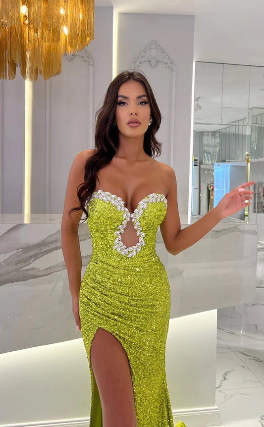 RP1651-Hot Green Mermaid Sweetheart Crystals Sequins Sleeveless Prom Evening Dresses Formal Party Gowns With Slit