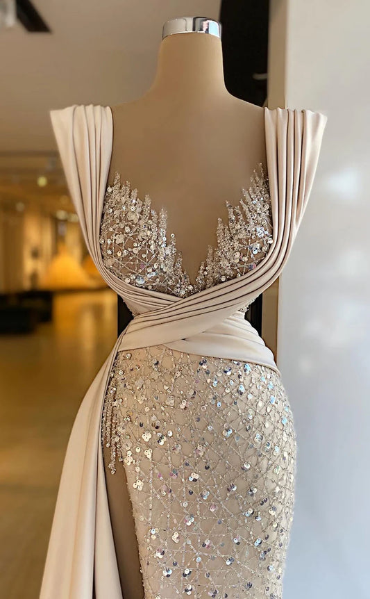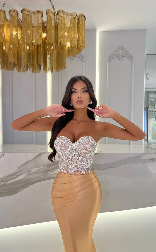 RP1652-Gorgeous Champagne Mermaid Sweetheart Crystals Sleeveless Satin Prom Evening Dresses Formal Party Gowns With Train