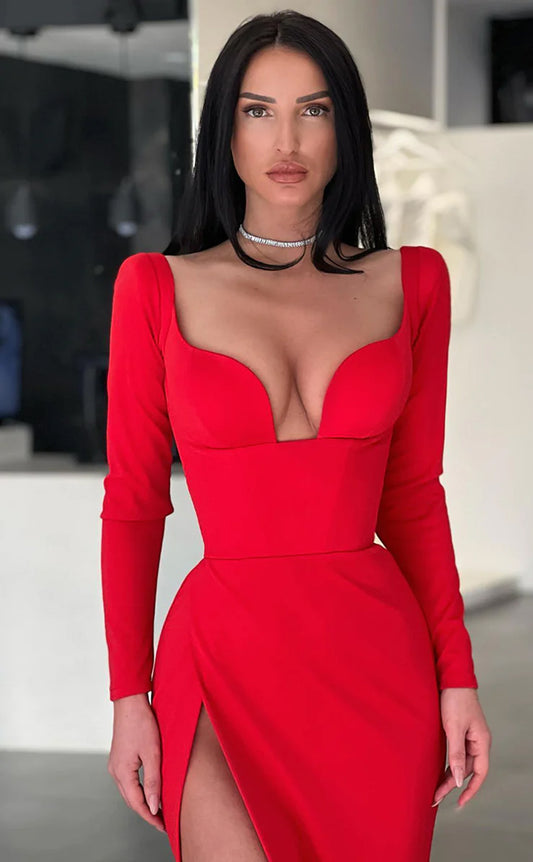 RP1636-Charming Red Mermaid Sweetheart Sequins Long Sleeves Prom Evening Dresses Formal Party Gowns With Slit