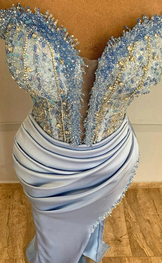 RP1681-New Sky Blue Mermaid Sweetheart Ruched Beaded Sleeveless Satin Prom Evening Dresses Formal Party Gowns With Slit