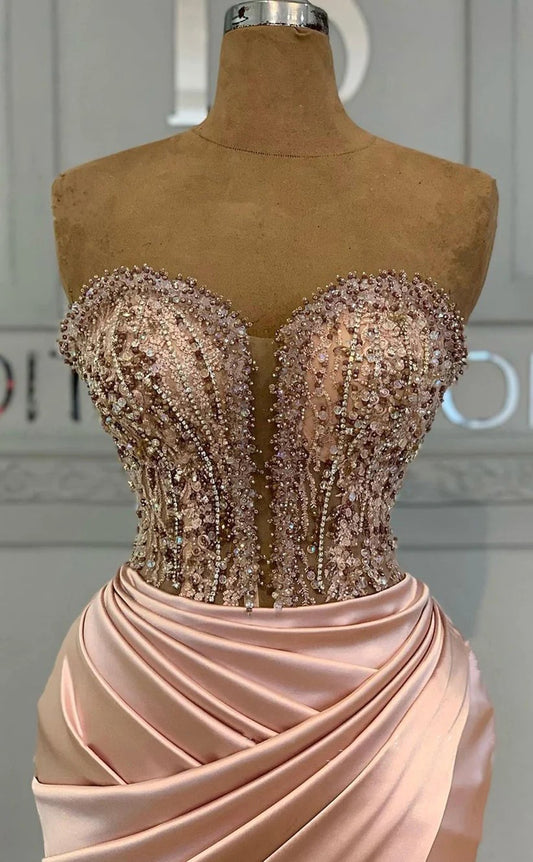 RP1683-New Powder Mermaid Sweetheart Ruched Beaded Sleeveless Satin Prom Evening Dresses Formal Party Gowns With Slit
