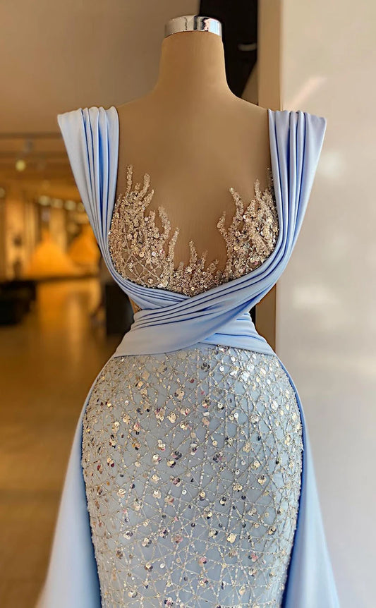 RP1659-New Sky Blue Mermaid Sweetheart Beaded Pleated Sleeveless Prom Evening Dresses Formal Party Gowns With Train