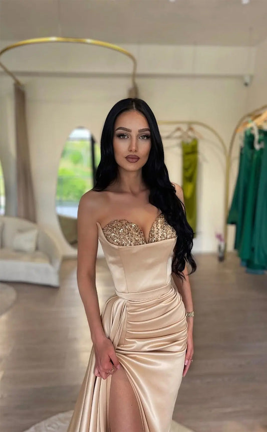 RP1556-Elegant Champagne Mermaid Sweetheart Beaded Ruched Sleeveless Satin Prom Evening Dresses Formal Party Gowns With Slit