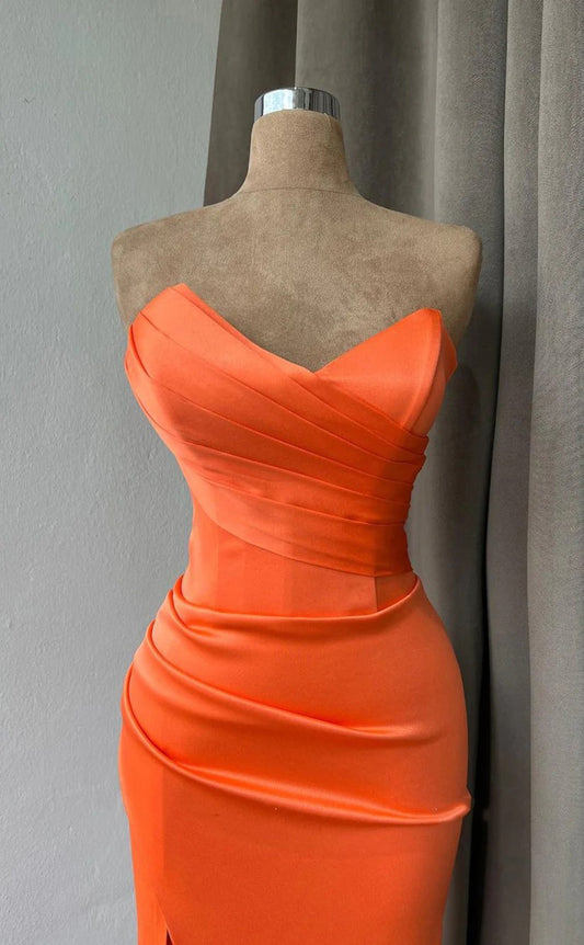 RP1554-Gorgeous Orange Mermaid Sweetheart Ruched Sleeveless Satin Prom Evening Dresses Formal Party Gowns With Slit