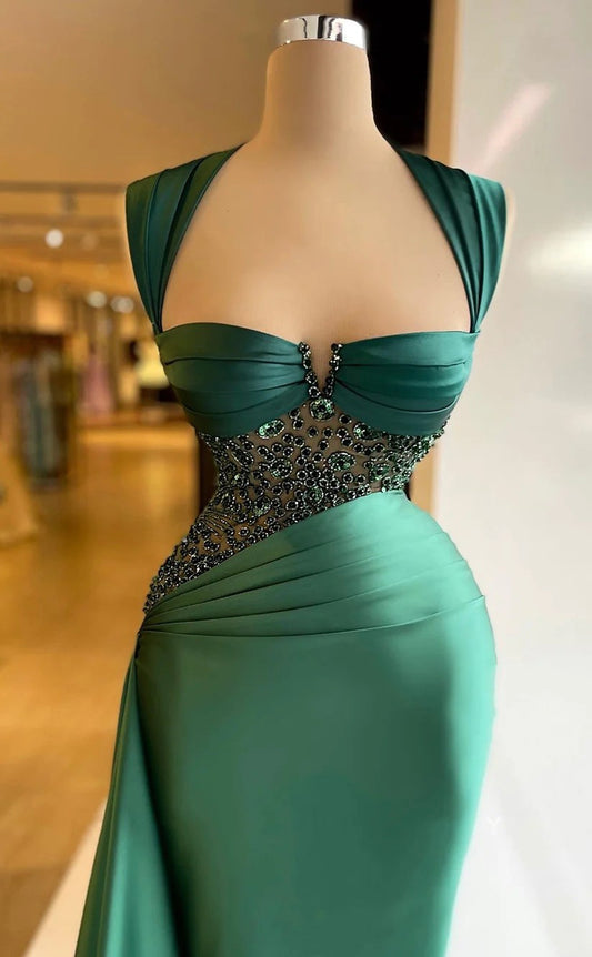 RP1554-Gorgeous Green Mermaid Sweetheart Beaded Ruched Sleeveless Satin Prom Evening Dresses Formal Party Gowns With Train