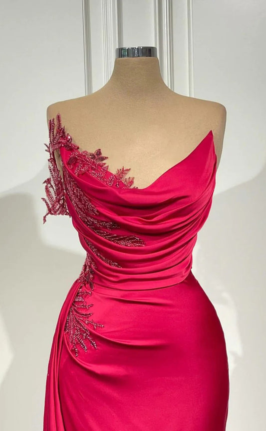RP1586-Elegant Mermaid Sweetheart Appliqued Ruched Sleeveless Satin Prom Evening Dresses Formal Party Gowns With Slit