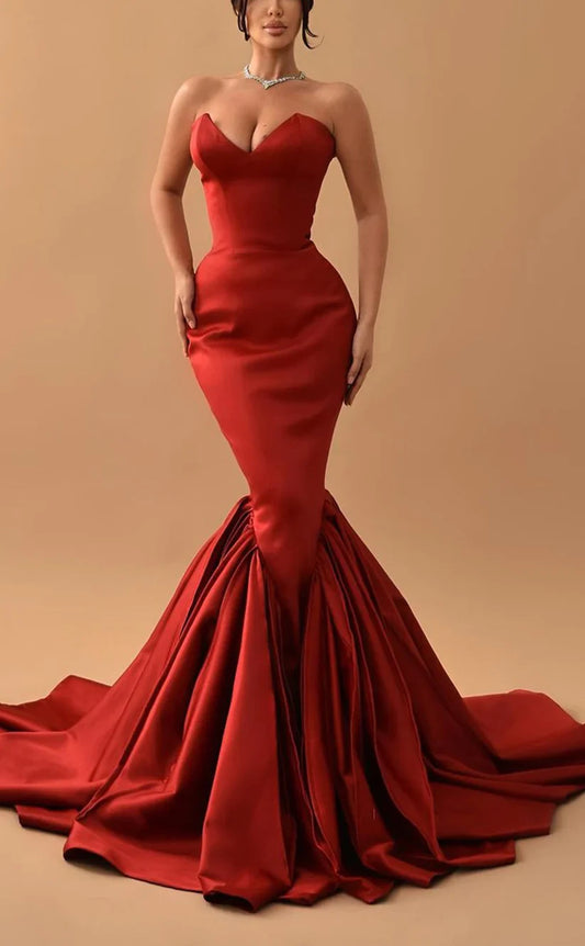 RP1534-Simple Red Mermaid Sweetheart Ruched Long Sleeves Satin Prom Evening Dresses Formal Party Gowns With Train