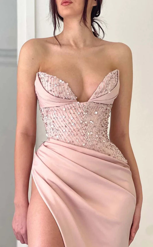 RP1495-Luxury Champagne Mermaid Sweetheart Crystals Sleeveless Prom Evening Dresses Formal Party Gowns With Slit