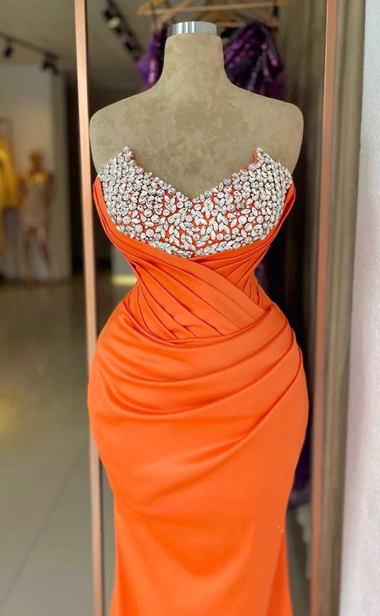 RP1537-Gorgeous Orange Mermaid Sweetheart Crystals Sleeveless Satin Prom Evening Dresses Formal Party Gowns