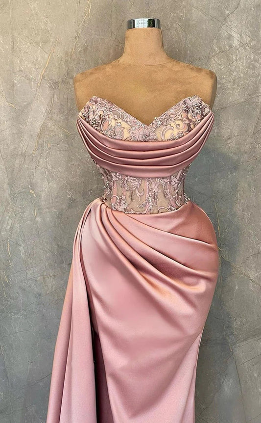 RP1545-Gorgeous Pink Mermaid Sweetheart Appliqued Sleeveless Satin Prom Evening Dresses Formal Party Gowns With Slit