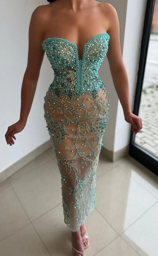 RP1182-Luxury Mermaid Sweetheart Beads Pearls Sleeveless Tea Length Prom Evening Dresses Formal Party Gowns