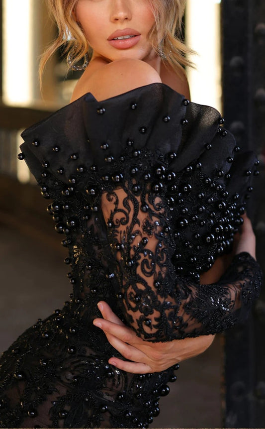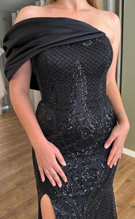 RP1044-Gorgeous Mermaid Black Strapless One Long Sleeves Appliqued Pearls Long Prom Evening Dresses Formal Party Gowns With Slit
