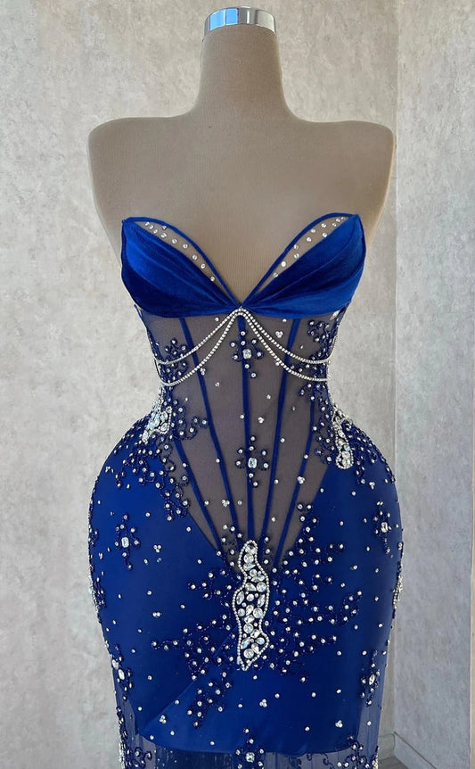 RP1319-Elegant Royal Blue Mermaid Sweetheart Beaded Crystals Sleeveless Prom Evening Dresses Formal Party Gowns