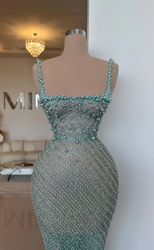 RP592-Luxury Mermaid Spaghetti Beads Pearls Sleeveless Tulle Long Prom Evening Dresses Formal Party Gowns