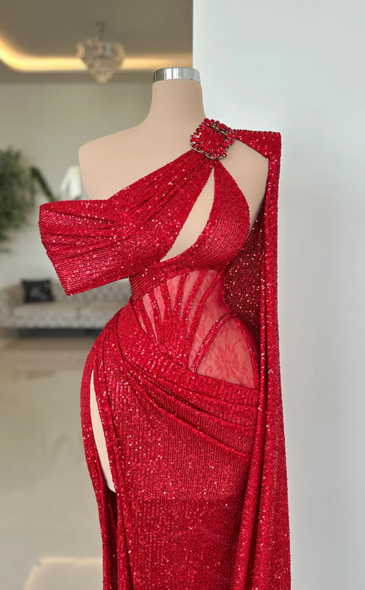 RP664-Eleagnt Red Mermaid One Shoulder Sequins Sleeveless Floor Length Prom Evening Dresses Formal Party Gowns With Slit