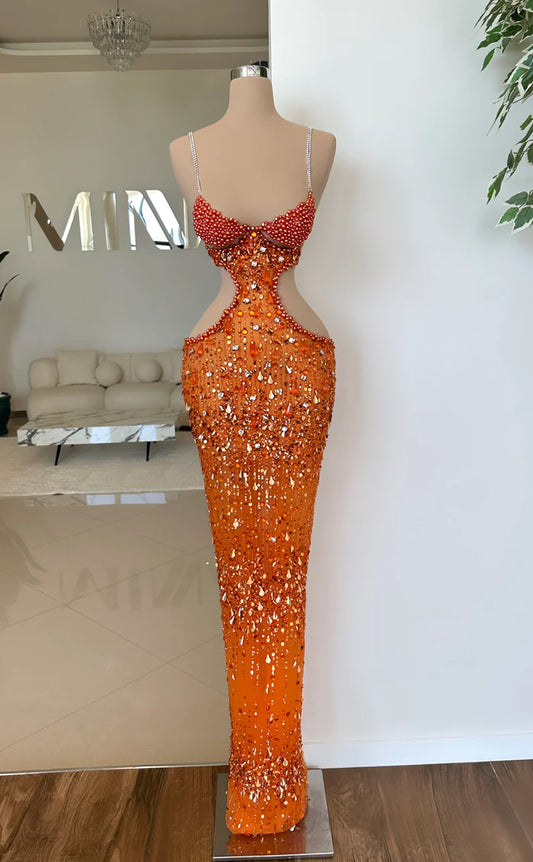 RP666-Luxurious Orange Mermaid Spaghetti Beads Crystals Pearls Sleeveless Floor Length Prom Evening Dresses Formal Party Gowns With Slit