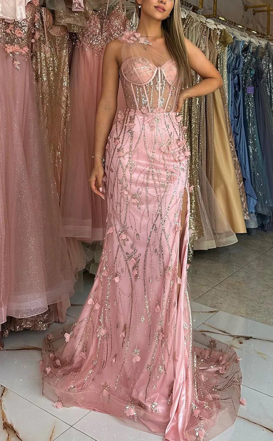 RP766-New Mermaid Pink One Shoulder Appliqued Sequins Long Prom Evening Dresses Formal Party Gowns With Slit