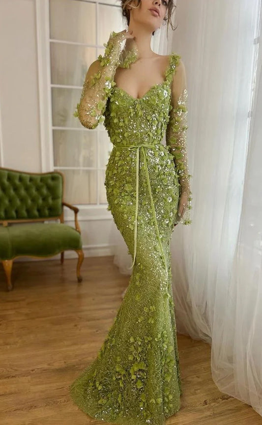 RP166-Green Mermaid Sweetheart Long Sleeves Beads 3D Flowers Long Prom Evening Dresses Formal Party Gowns