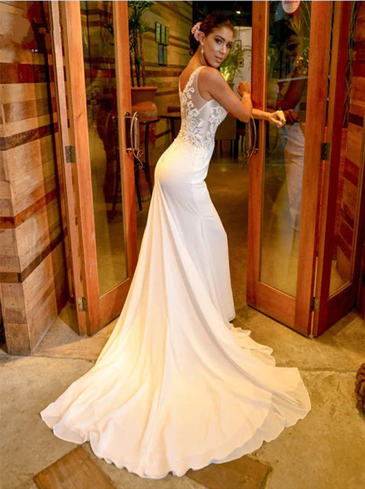 Sexy Mermaid Wedding Dresses V-Neck Appliques Zipper Sleeveless Sweep Train Satin Bridal Gowns Custom Made