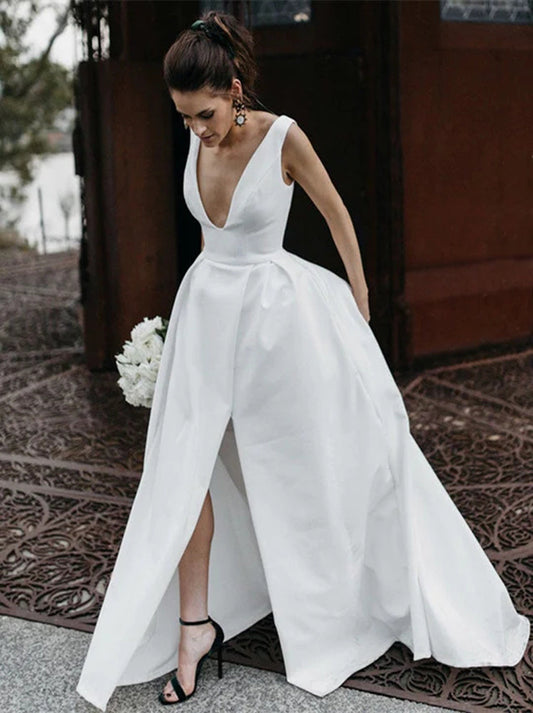 Simple A-Line Wedding Dresses V-Neck Sleeveless Backless Satin Sweep Train Bridal Gowns Custom Design
