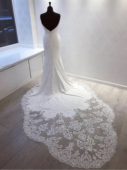 Elegant Mermaid Wedding Dresses Spaghetti Appliques Lace Sleeveless Court Train Satin Bridal Gowns Custom Made