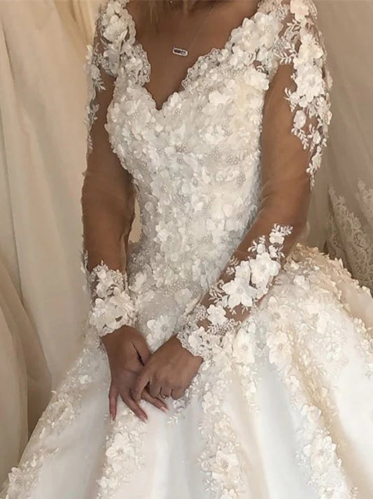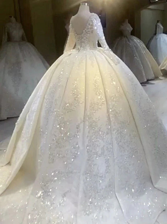 Luxurious Ball Gown Wedding Dresses V-Neck Long Sleeves Beads Appliques Covered Buttons Lace Court Train Bridal Gowns Custom Made