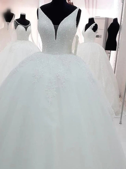 Charming Ball Gown Wedding Dresses V-Neck Appliqued Sequins Backless Tulle Sweep Train Bridal Gowns Custom Made