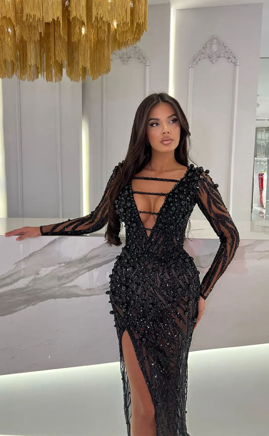 RP1702-Luxurious Mermaid V-Neck Pearls Beads Long Sleeves Prom Evening Dresses Formal Party Gowns With Slit
