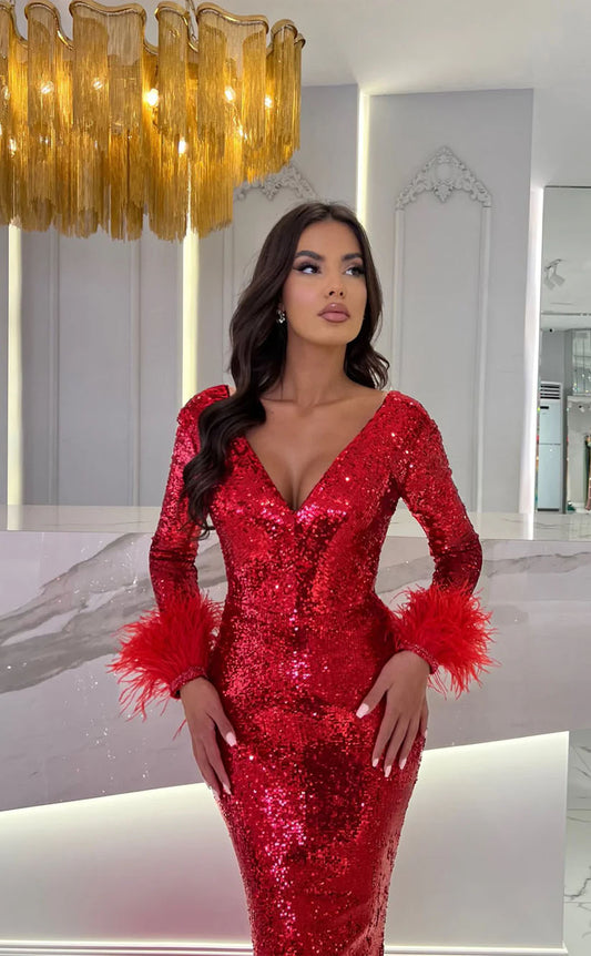 RP1749-Charming Red Mermaid V-Neck Feather Sequins Long Sleeves Prom Evening Dresses Formal Party Gowns With Train