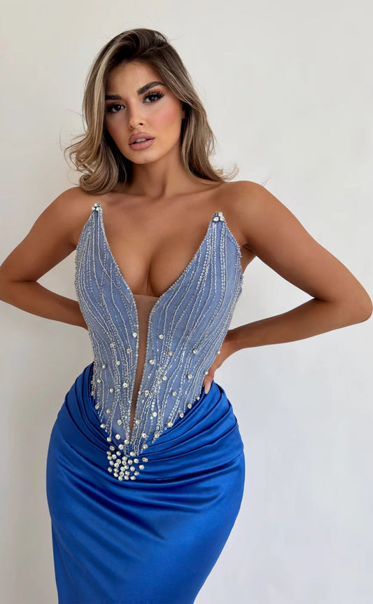 RP1707-New Royal Blue Mermaid V-Neck Beads Sleeveless Satin Floor Length Prom Evening Dresses Formal Party Gowns