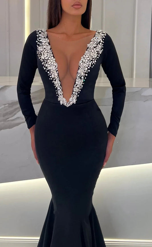 RP1613-Elegant Black Mermaid V-Neck Beaded Appliqued Long Sleeves Satin Prom Evening Dresses Formal Party Gowns With Slit
