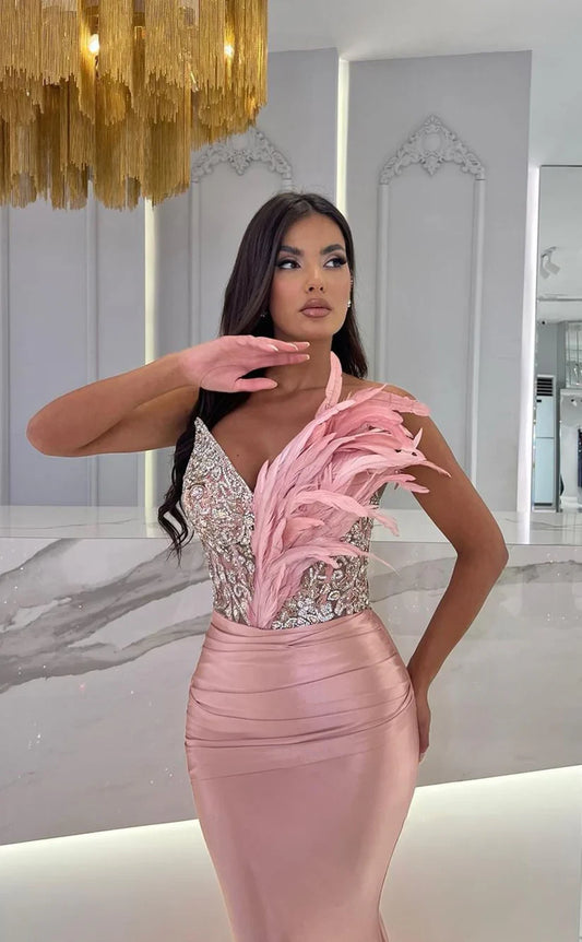 RP1826-New Pink Mermaid V-Neck Appliqued Feather Sleeveless Satin Prom Evening Dresses Formal Party Gowns With Train
