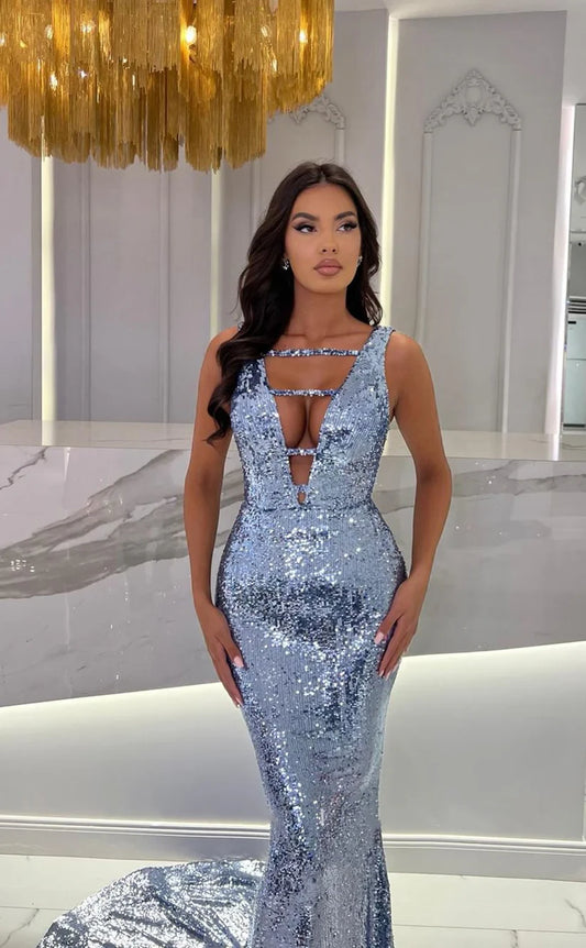 RP1827-New Blue Mermaid V-Neck Sleeveless Sequins Prom Evening Dresses Formal Party Gowns With Train