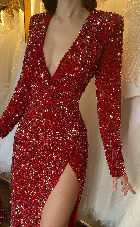 RP1844-New Red Mermaid V-Neck Long Sleeves Sequins Prom Evening Dresses Formal Party Gowns With Slit