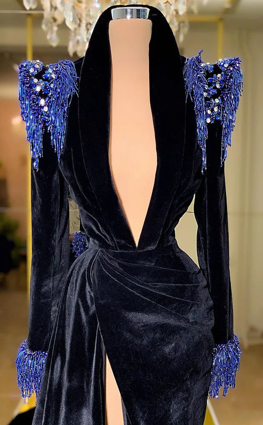 RP516-Elegant Black Mermaid V-Neck Crystals Tassel Velvet Long Sleeves Prom Evening Dresses Formal Party Gowns With Slit