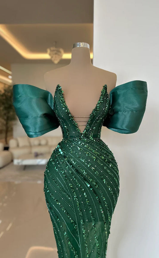 RP562-Luxury Green Mermaid V-Neck Beads Sequins Puffy Cap Sleeves Floor Length Prom Evening Dresses Formal Party Gowns