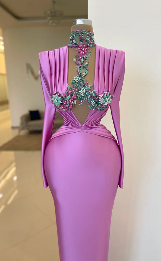 RP645-Elegant Mermaid V-Neck Beads Appliqued Ruched Long Sleeves Floor Length Prom Evening Dresses Formal Party Gowns