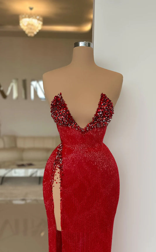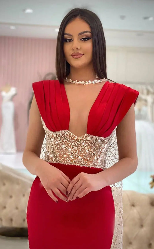 RP684-Eleagnt Red Mermaid V-Neck Beads Sequins Sleeveless Floor Length Prom Evening Dresses Formal Party Gowns With Slit