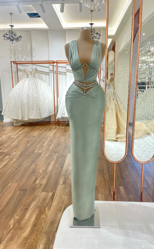 RP622-Gorgeous Green Mermaid V-Neck Beads Ruched Sleeveless Long Prom Evening Dresses Formal Party Gowns